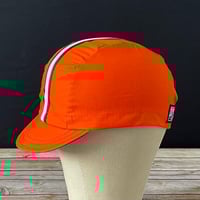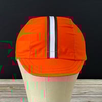 Our most popular cap inspired by our hometown football team! Made of orange cotton with brown and white matte grosgrain ribbon stripes. Brown on underside of brim. Great under a bike helmet or for just hanging around thinking about sportsball.