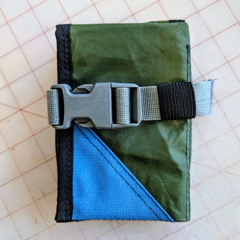 This version is made from decommissioned olive drab US Army dry-bag material, paired with blue Cordura and surplus grey Milspec webbing and buckles, all sourced from local small suppliers.